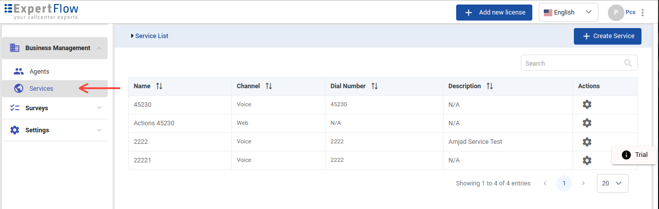 Go to the Business Management→ Services menu to view the Services list.