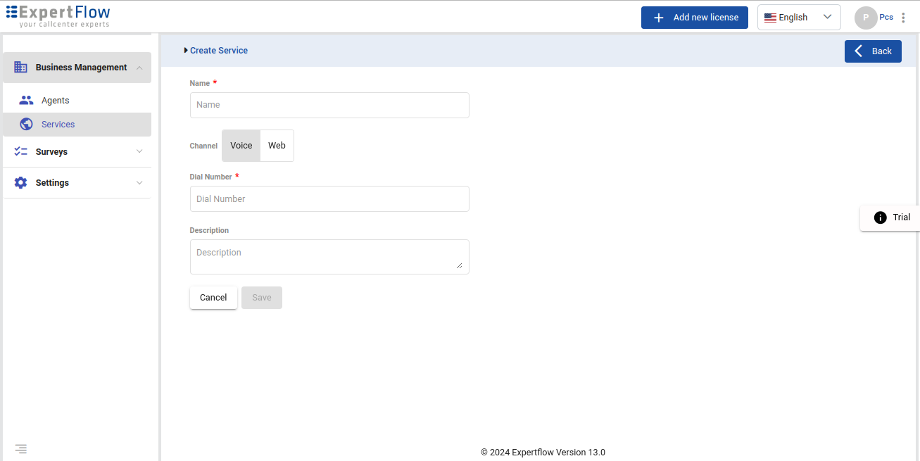 Click the New Service button to add a new contact center service. Add the Name, Channel, Dial Number, and Optional description, and then click save.