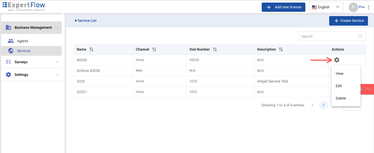 See the Actions drop-down to make changes to any service later on from the Services List.