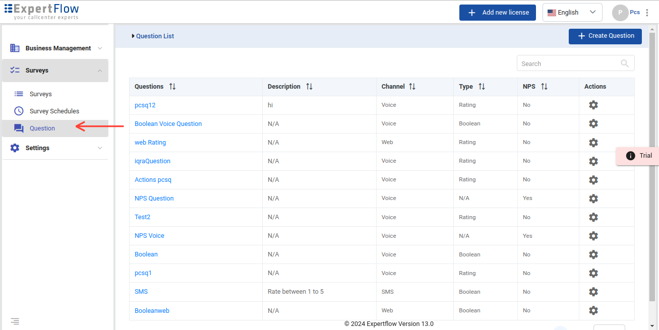 Go to Surveys → Questions to access the Questions list.