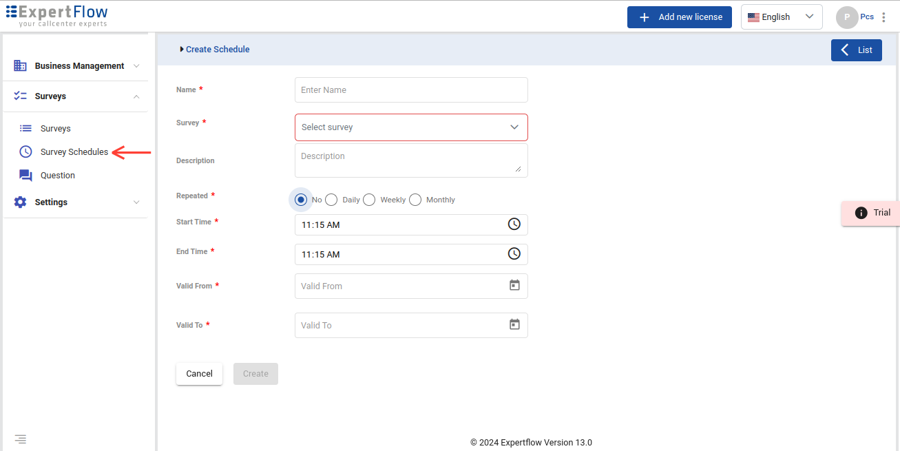 Click the Create button to create a survey schedule.