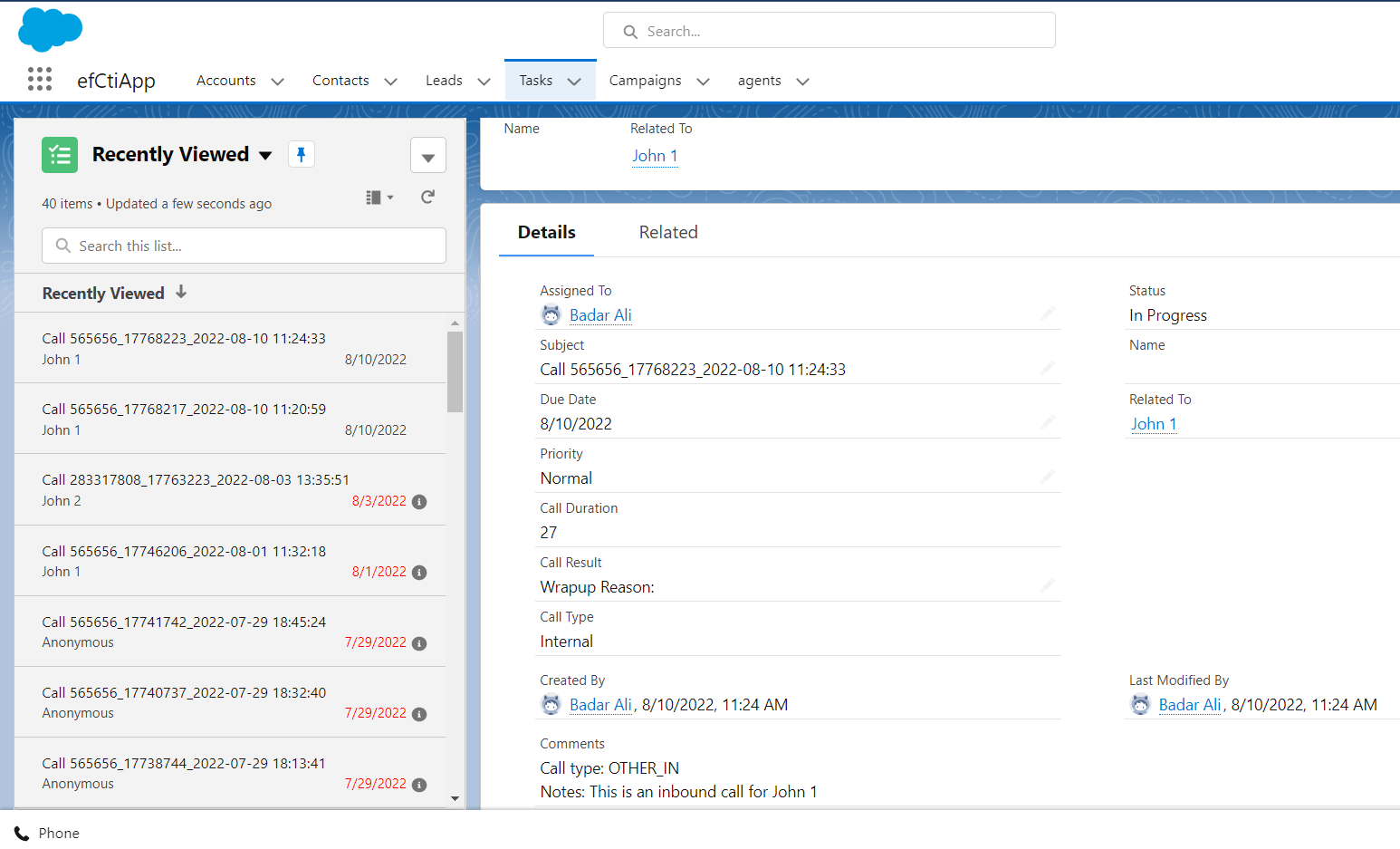 Call activities can be seen from the ‘Tasks’ tab at the top, it will show the activities in descending order i.e. latest activity will be at the top. In the case of single matching or no matching record, it will be created automatically.