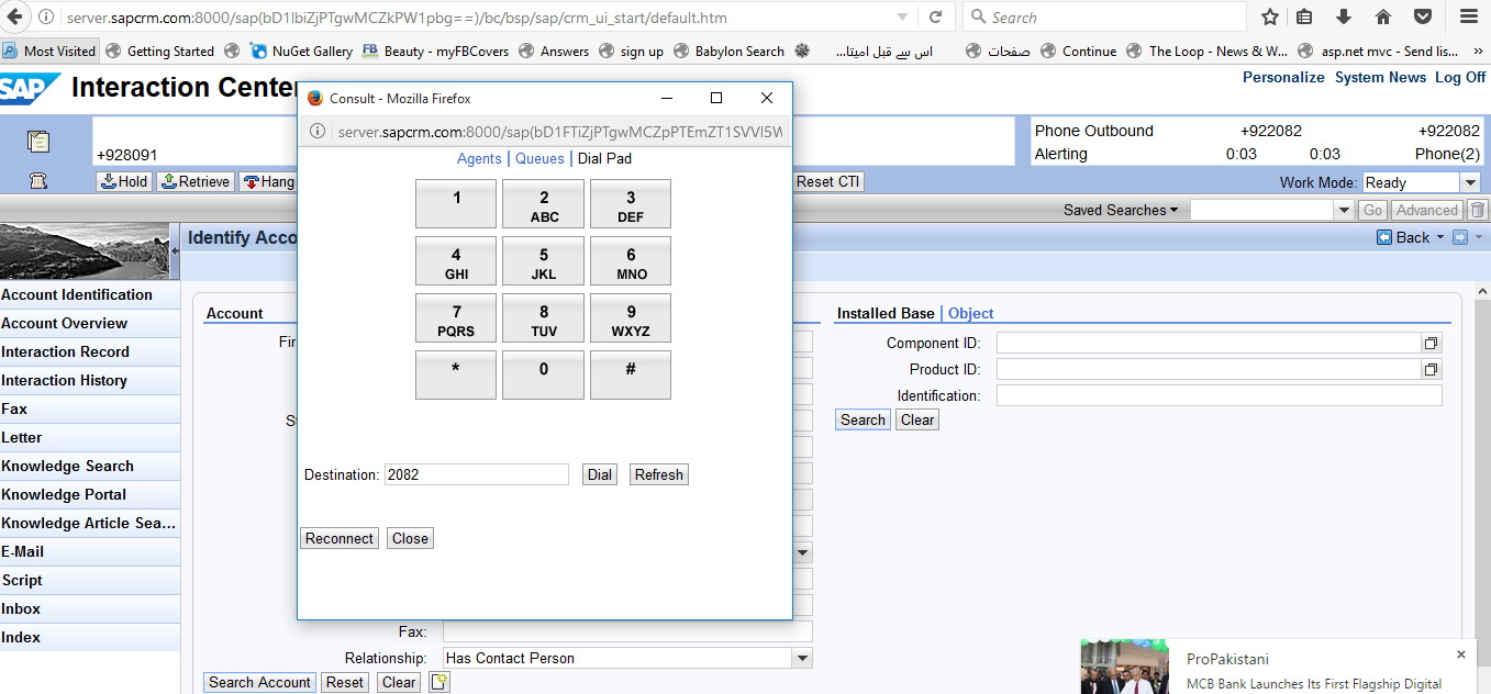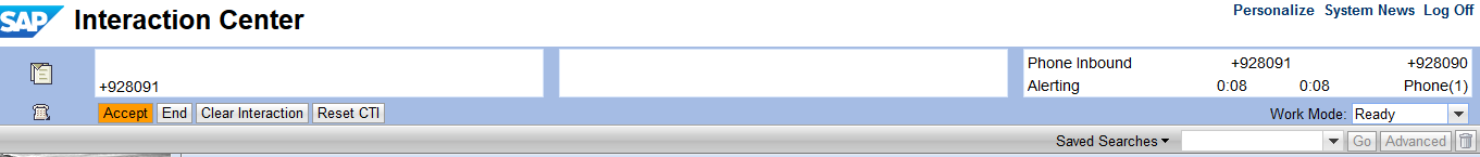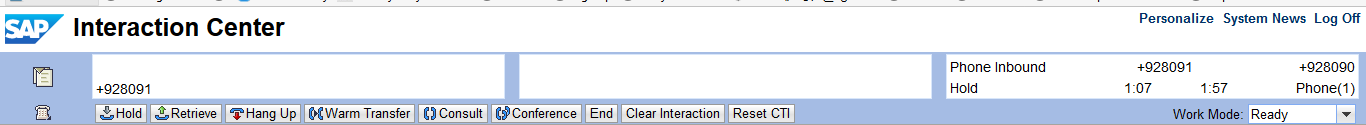 On call arrival, the SAP CRM retrieves the caller information based on the calling number. If there is no information stored in the system related to the calling number, only the phone number is shown in the box top right of the screen, as in the figure below,