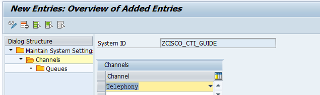 Add Channels for the created entry. Highlight the entry on the right and click on Channels. The channels is scope should be added to the communication management software system, and in our case only Telephony is added