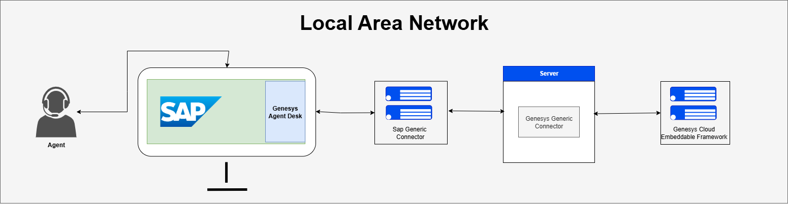 The Genesys Agent Desk is embedded within SAP using the Genesys Cloud Embeddable Framework, which utilizes WebRTC and APIs.