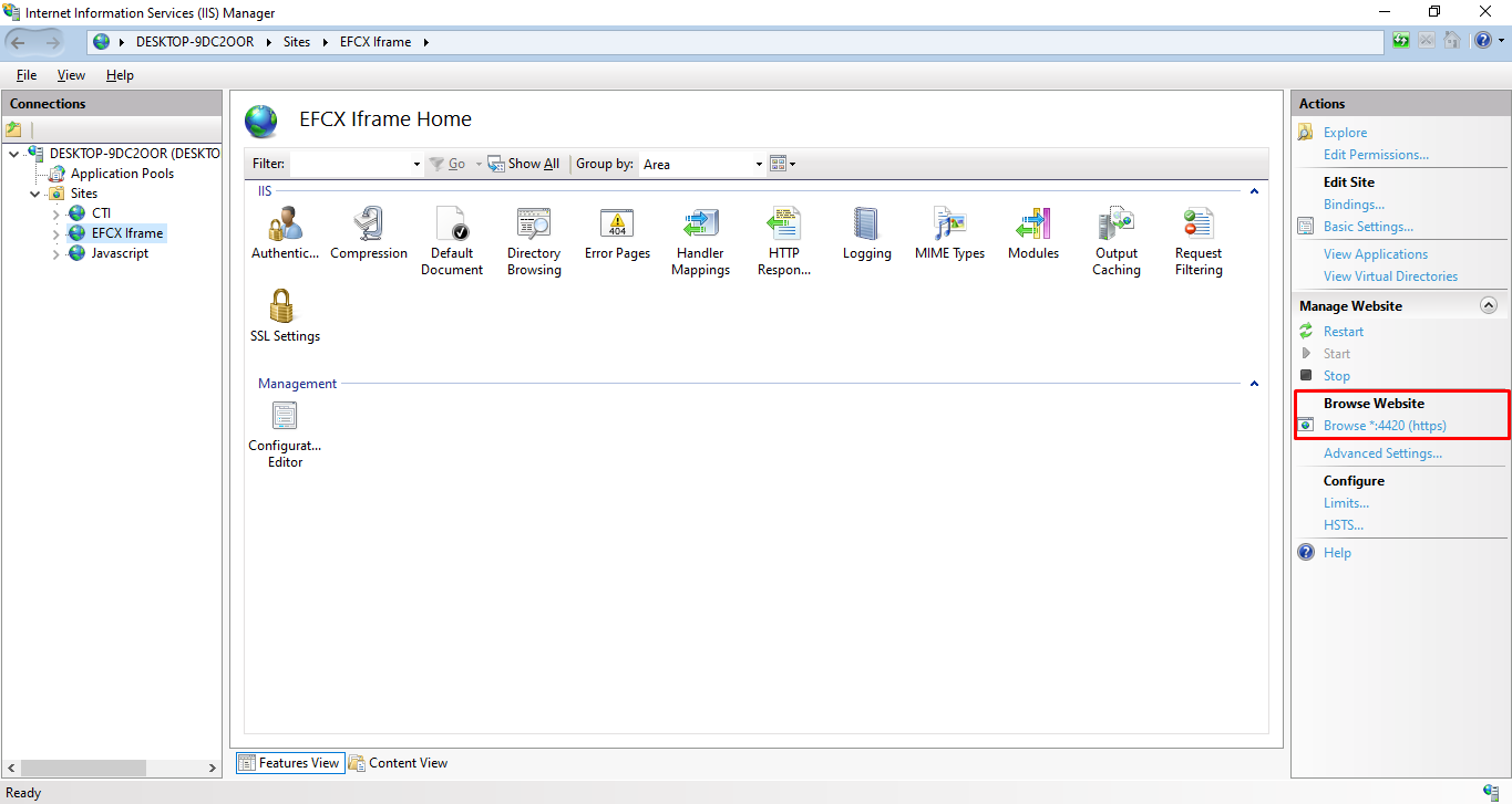 Please follow this guide to install and configure the SSL certificates on IIS in order to run the EFCX connector on HTTPS.