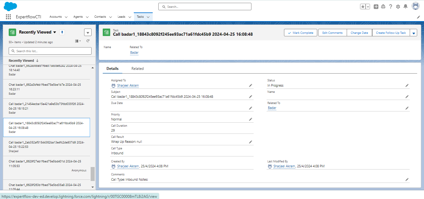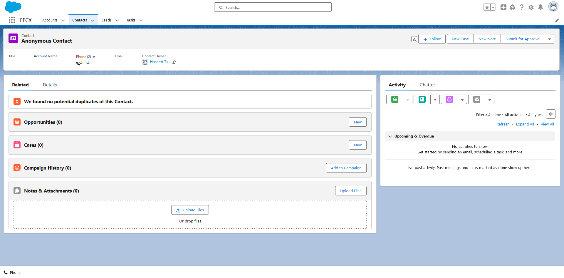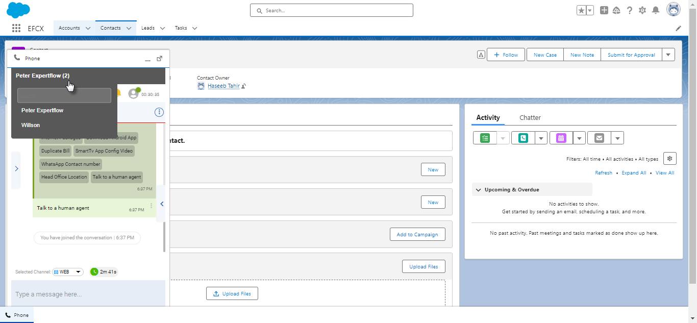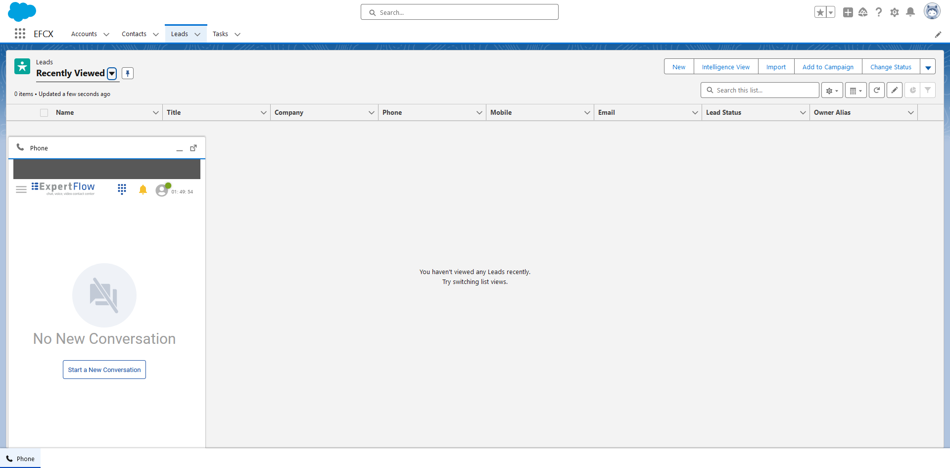 This embedded EFCX Connector runs inside the Salesforce CRM Web UI and enables agent/call controls within Salesforce allowing agents to use the same CRM agent interface for all call and chat handling and transfer. The EFCX Connector has the following feature set