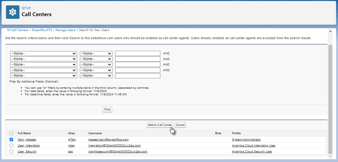 At the bottom you’ll find the “Manage call center users” option. If you can’t find manage “Manage call center users”, then first save the call center and then look for the same option.