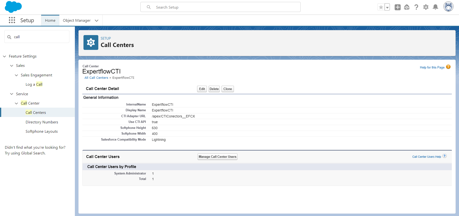 From Setup, in the Quick Find box, enter “Call Centers”, then select Call Centers.