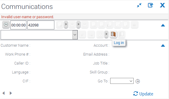 The application supports agent login to Cisco Contact center. The agent will only have to provide his/her extension number on the toolbar and press the login button to login on the ACD.