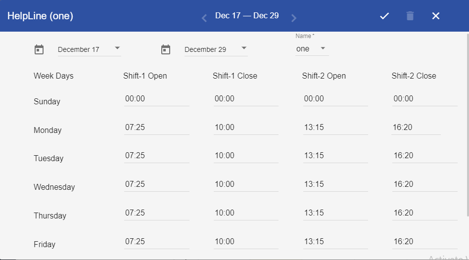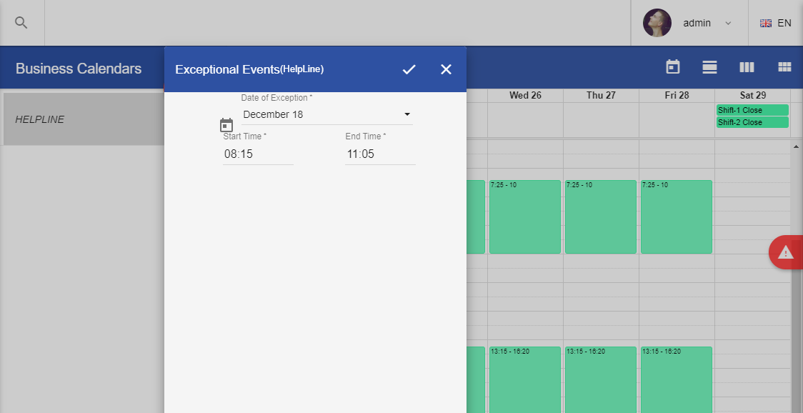 Once the Business calendar is created, add the working shift schedule in the calendar. Multiple shift schedules can be added in a calendar.
