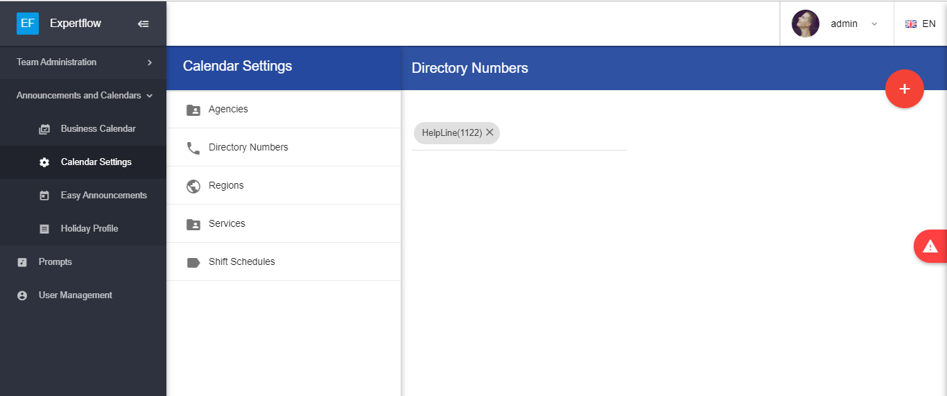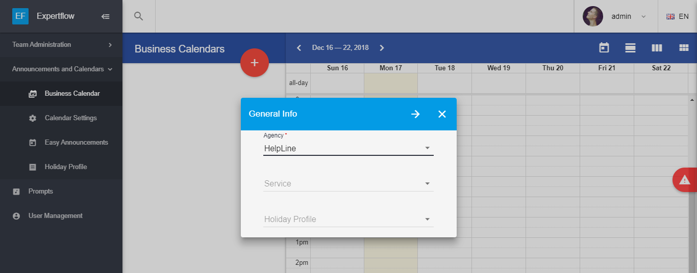 This interface allows users to create new or change an existing business calendar, e.g they can create Exceptional hours for an unplanned outage. By adding calendar time/date, managers can insert scheduled announcements within a call script.