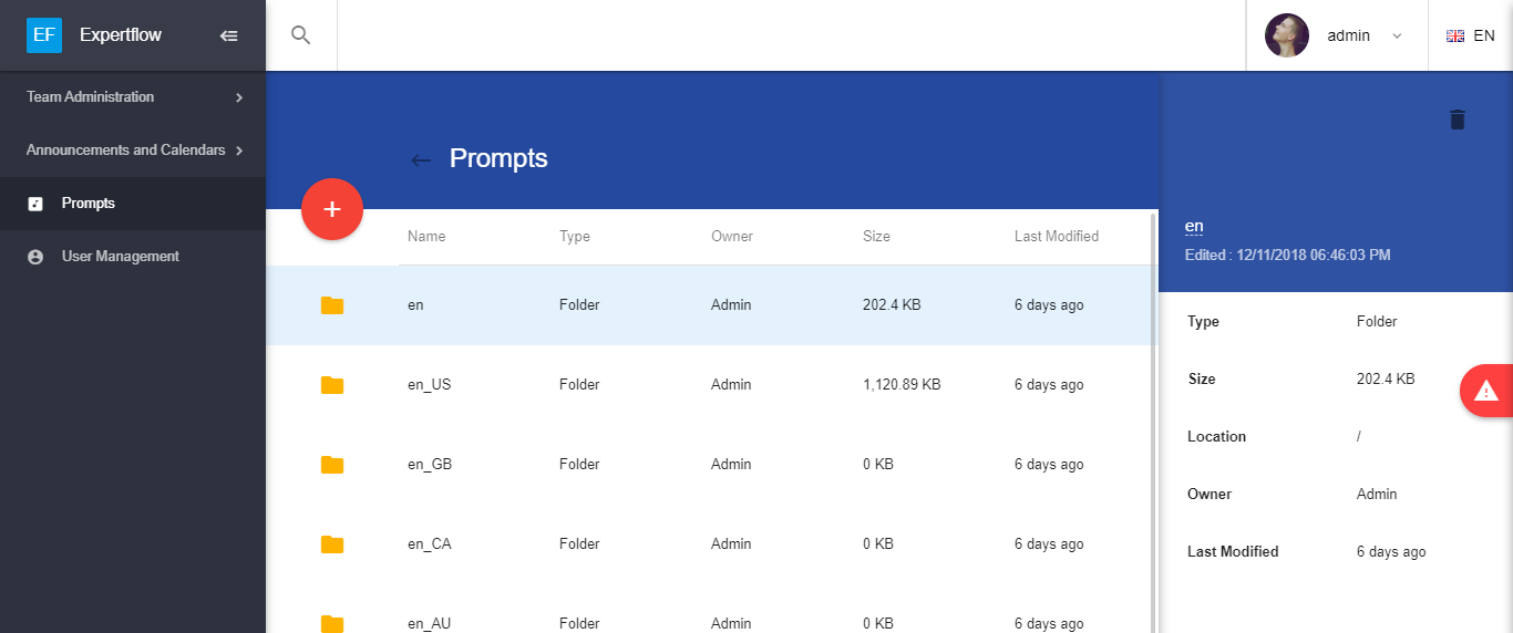 To create a new folder or Upload a prompt file, hover your mouse on the ‘+’ icon on the top of the screen. Click the folder icon to upload a new folder and/or prompt icon to upload a new audio file.