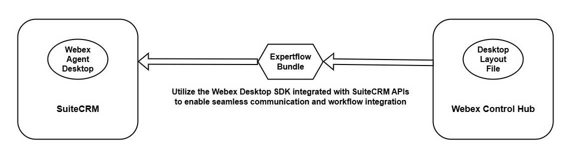 The Webex Agent Desktop communicates with SuiteCRM through the Expertflow Bundle.