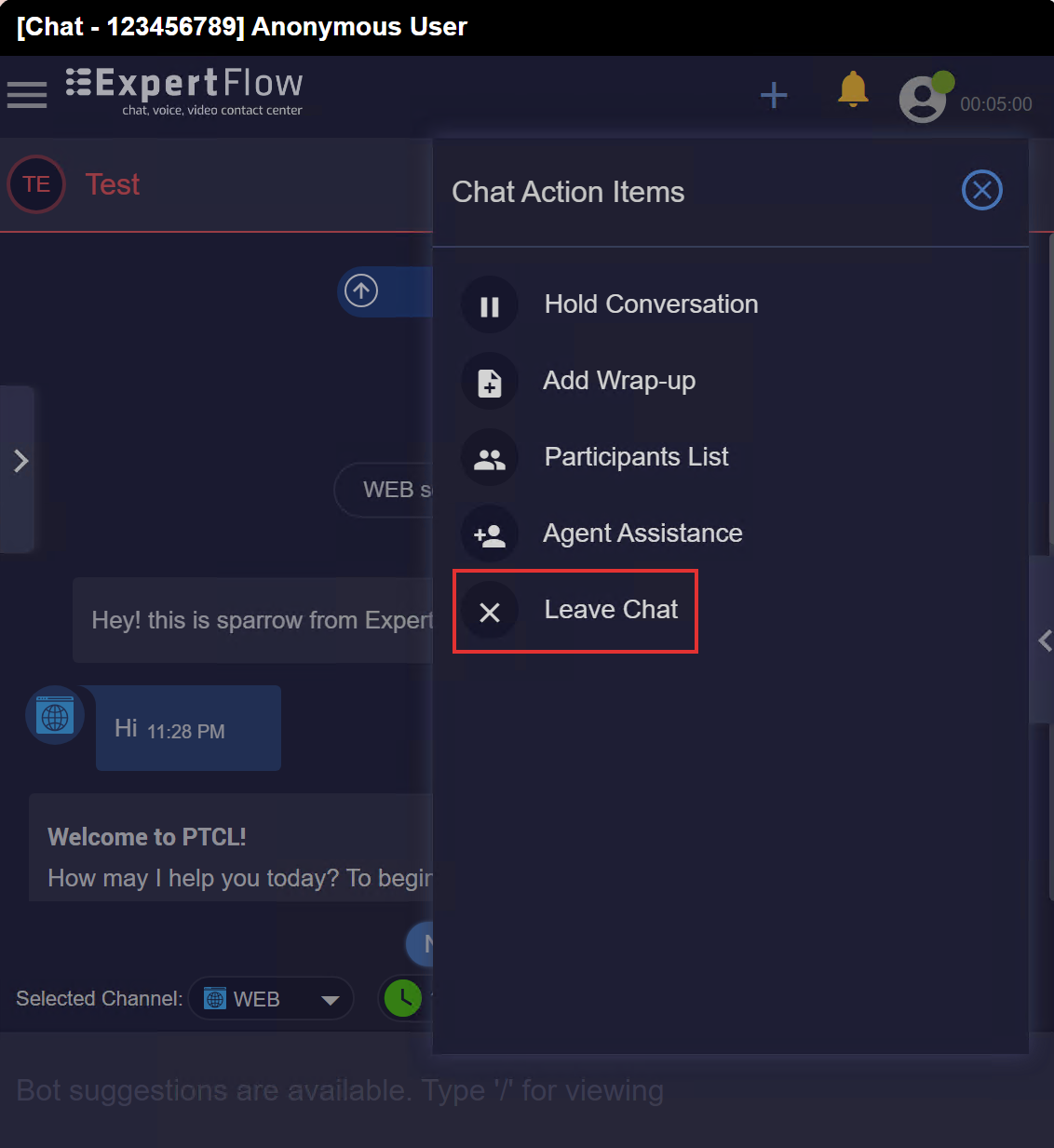 Whenever a conversation is closed from either side, a wrap-up window pops up. The wrap-up timer can be seen on the right-hand side. Predefined wrap-up reasons are displayed here.