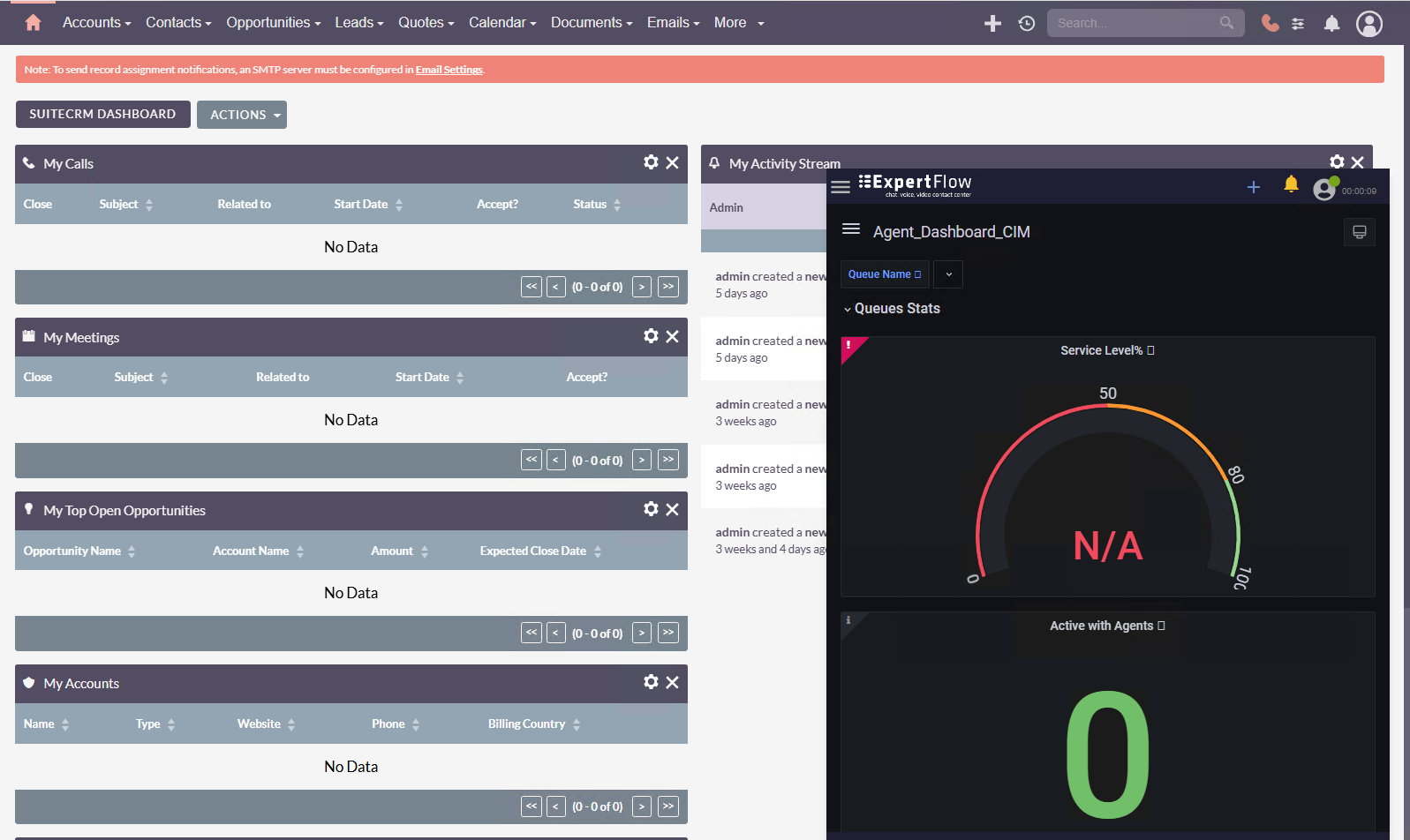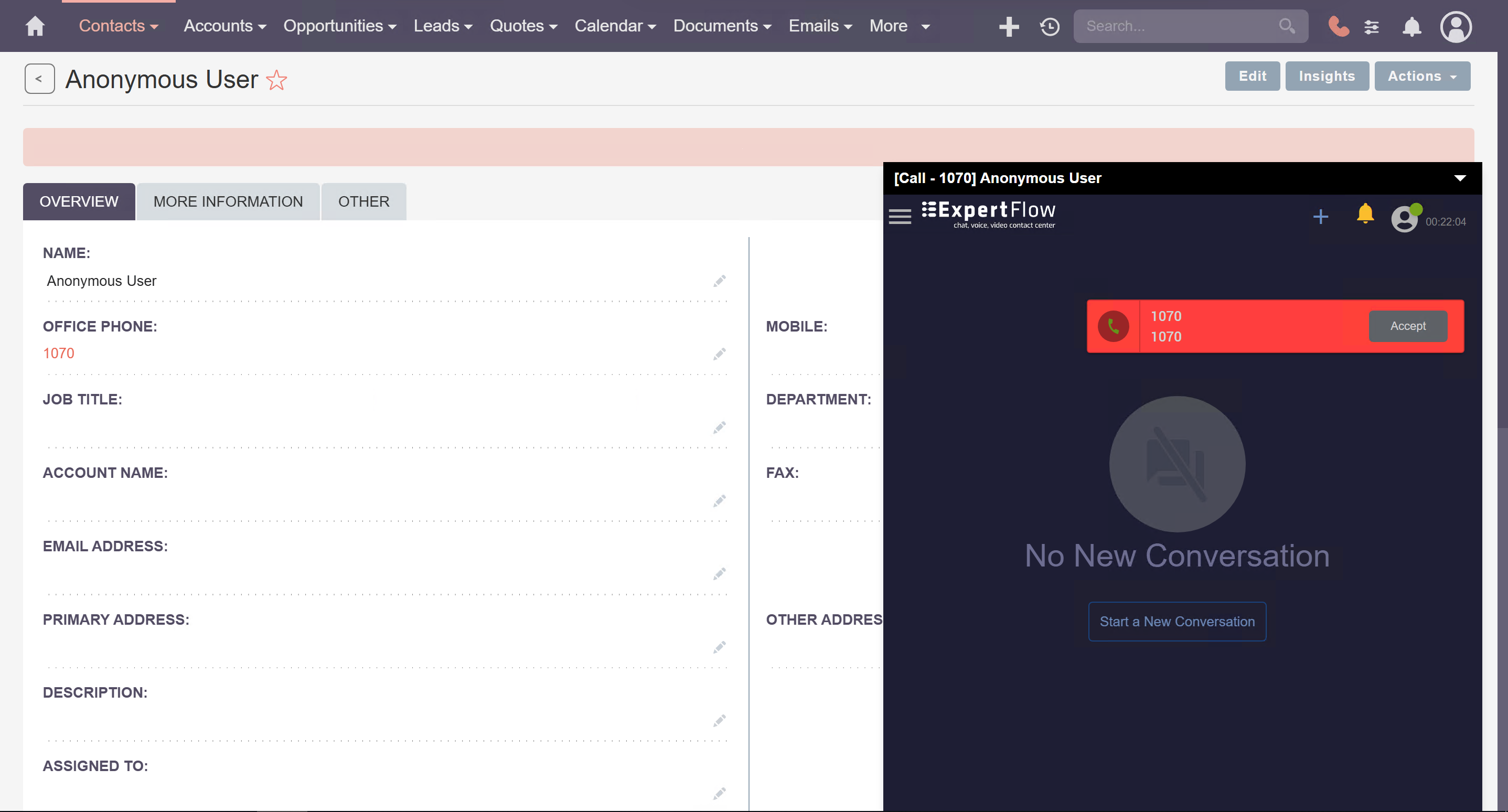 This integration between EFCX Connector and SuiteCRM allows agents to use the same CRM interface for all call and chat handling and transfer. The EFCX Connector has the following feature set: