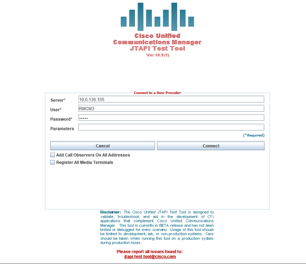 Step 5. Add cucm server IP, and jtapi username, password. Press connect button
