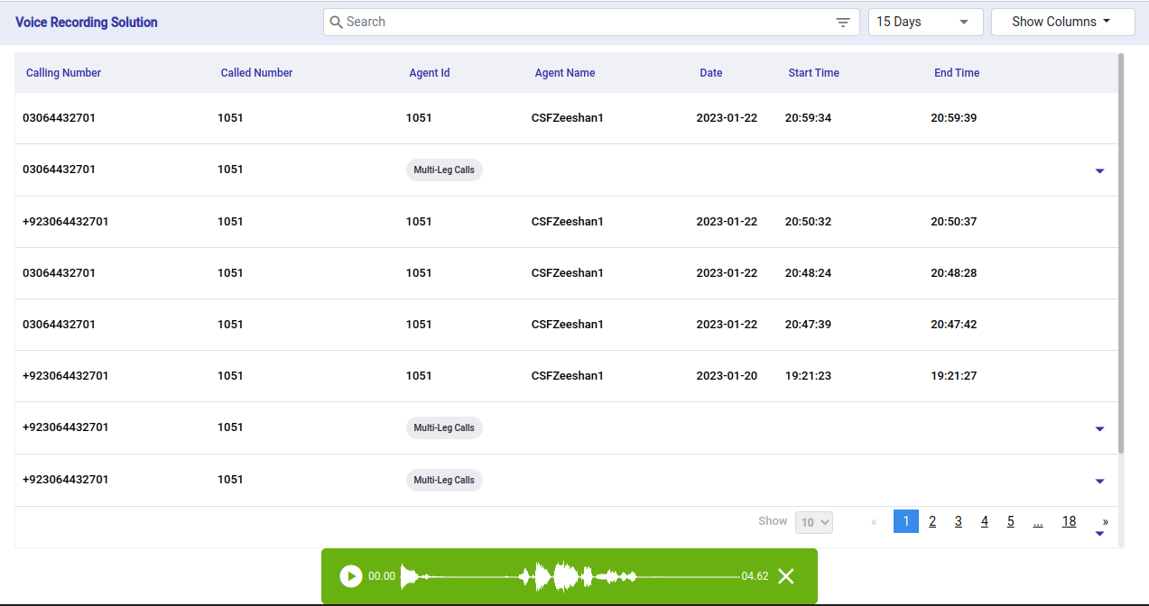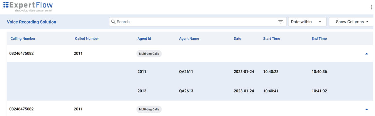 The Expertflow Voice Recording Solution records Cisco Contact center calls, for single & multi-site contact centers with up to 100 concurrent agents. Calls are recorded & stored as individual call legs including call hold, call transfer, and call conference.