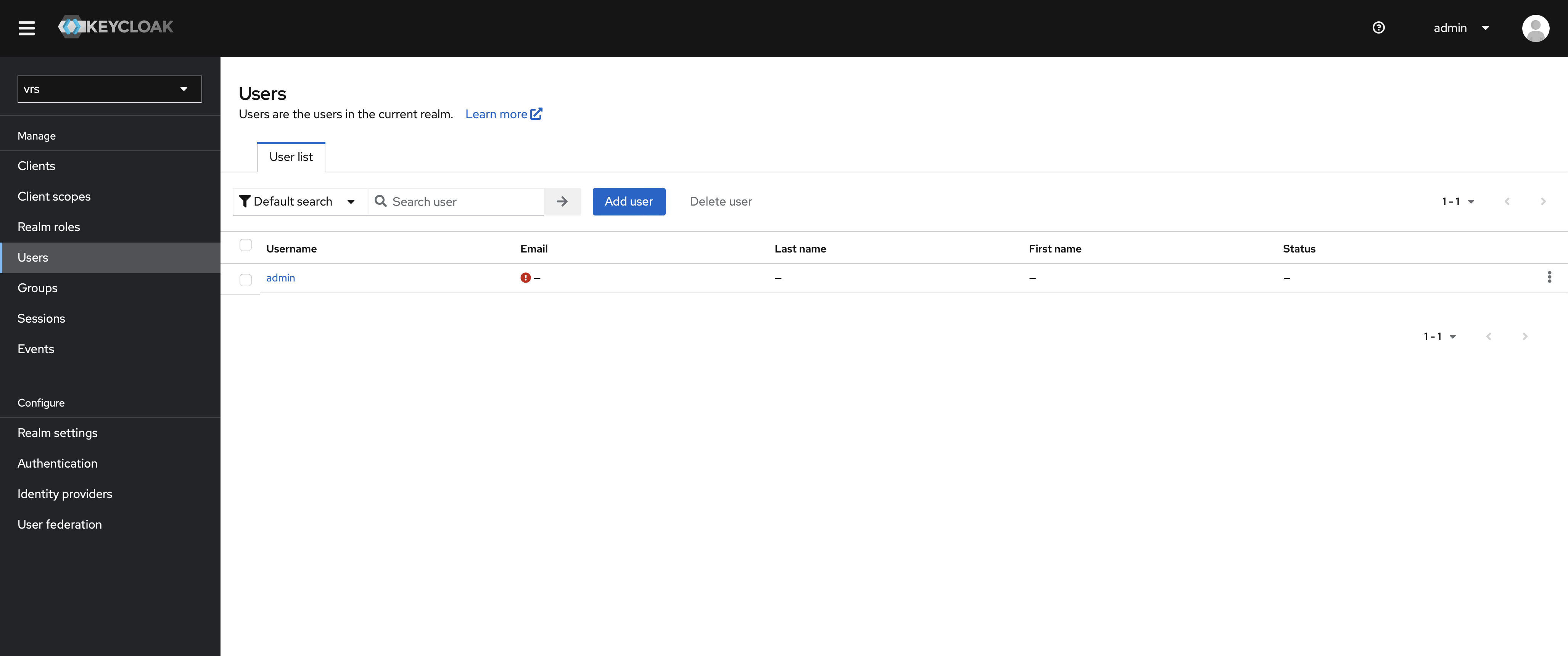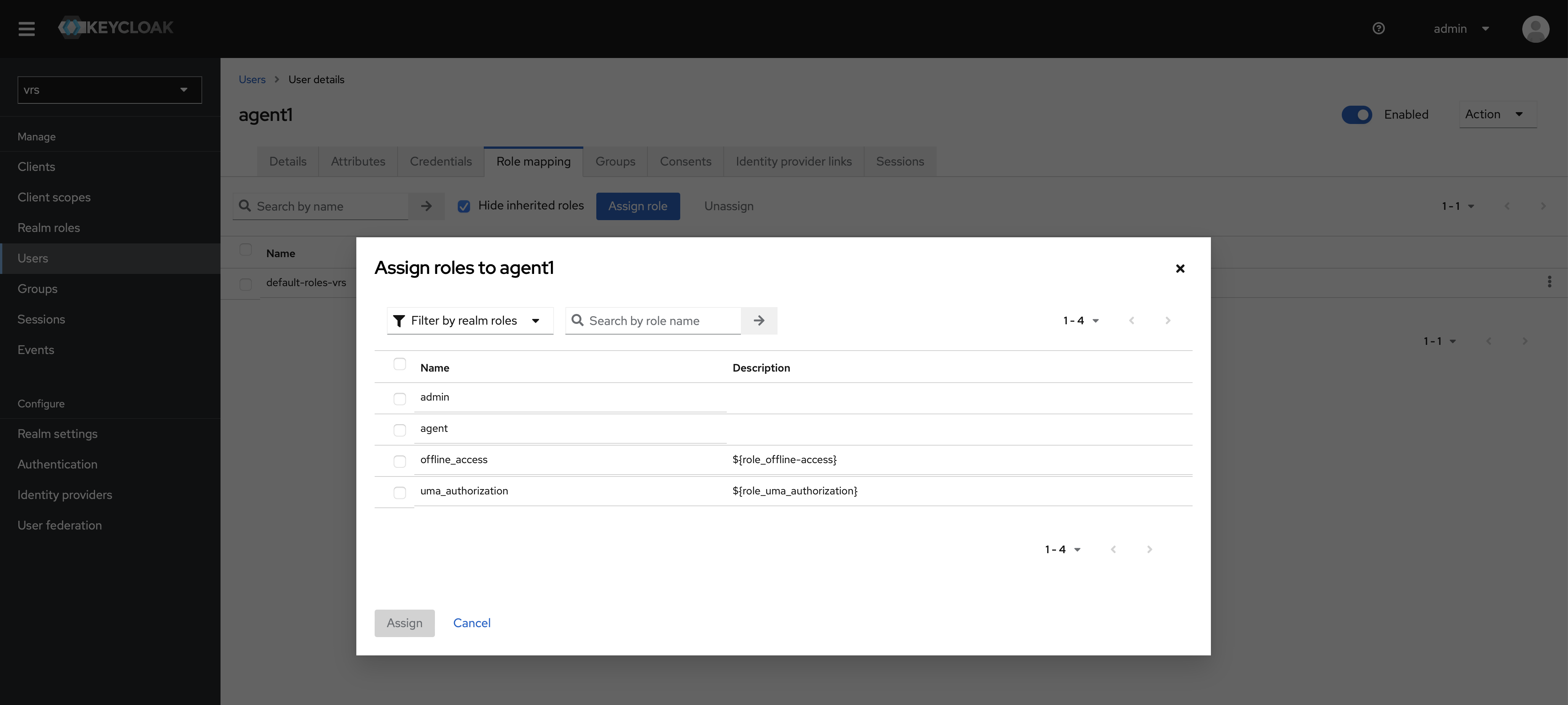 The Keycloak admin must select one role for the newly created. If a user is assigned an agent role, then on logging in on VRS the agent user can see his recordings. If a user is assigned an admin role, then he can see all recordings on VRS. Note that if a user is not assigned any role then he won't be able to log in to VRS