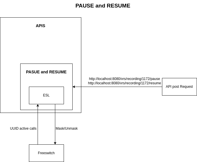 Inside Apis we have two end point in the controller that handles pause and resume request. With pause and resume service we have an ESL service responsible for the connection making and handling. Inside Pause and resume service we have two major functions one is to mask and other is to umask. These functions are dependent on esl connection for fetching call information and also on another function that extract all the useful information from the response and help masking or unmasking a call.