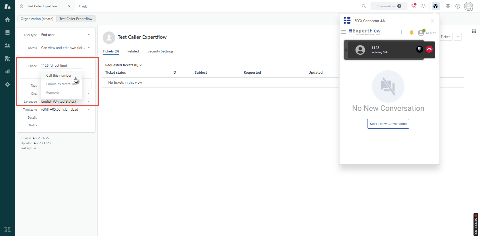 If there is no match, a Customer will be saved with the name set to ‘New Caller’, and the number set to the caller number. (By default for the No-Match case we create the Customer, however this is a configurable option and the user can change it as per his requirement).