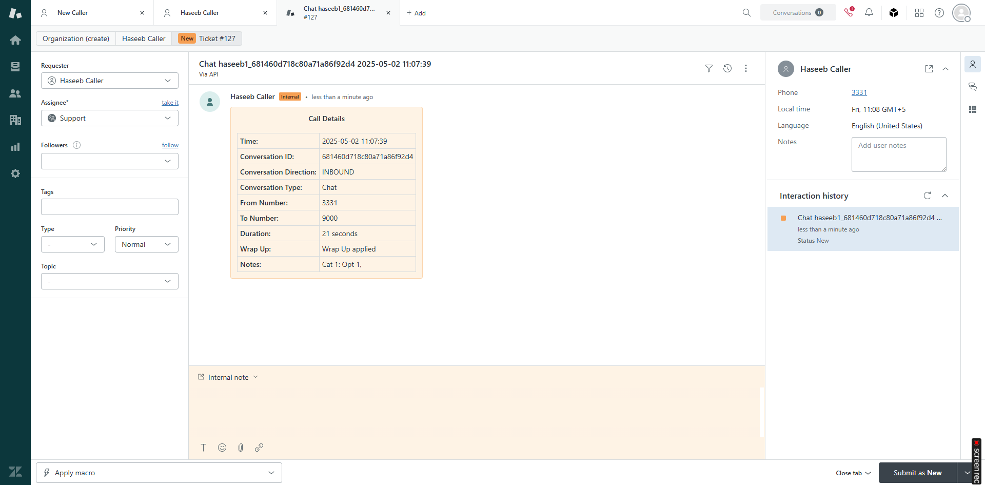 When a conversation arrives on the logged-in agent, a CRM customer record is popped up according to the customer’s number and information stored in Zendesk.