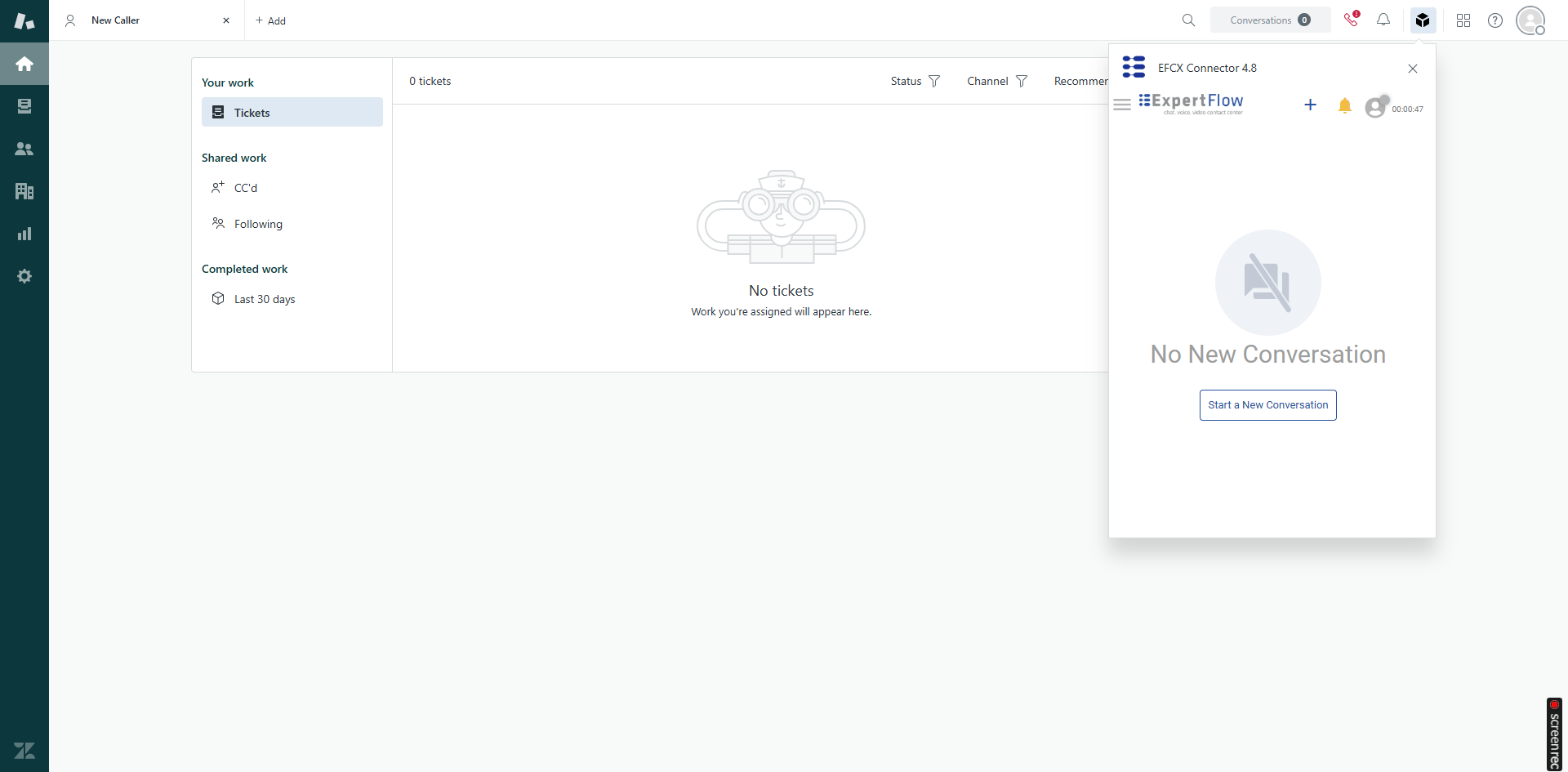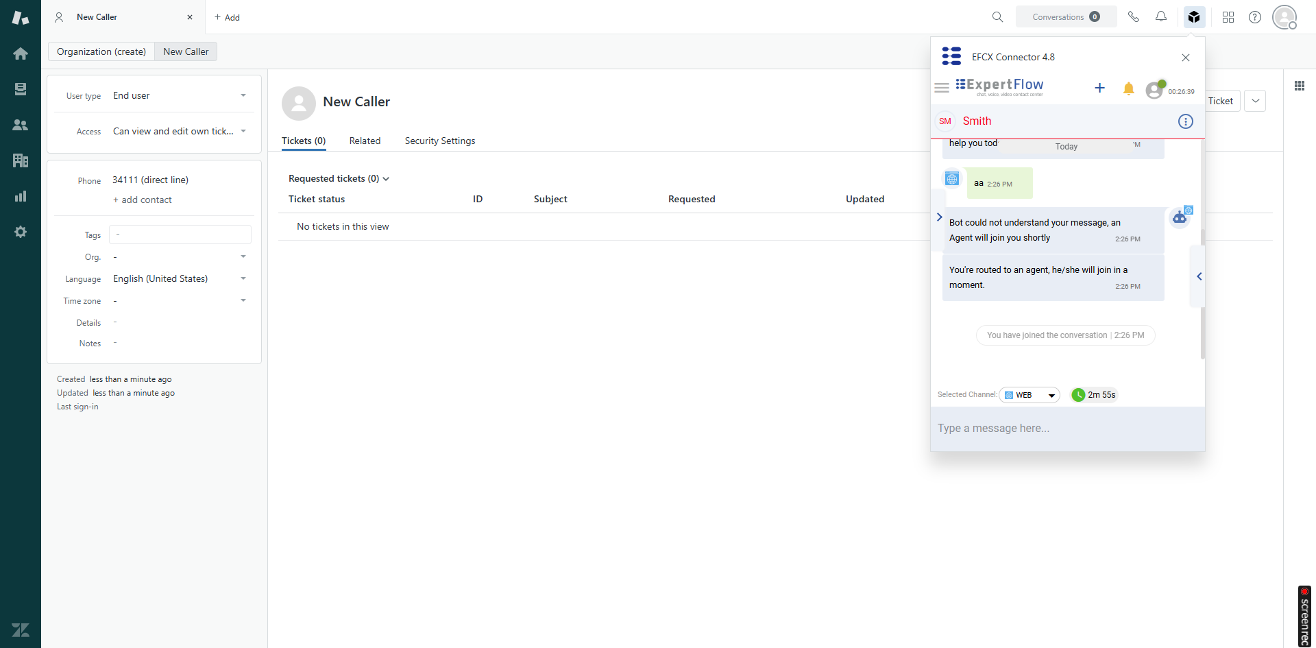 This embedded EFCX Connector runs inside the Zendesk CRM Web UI and call controls within Zendesk allowing agents to use the same CRM agent interface for all call and chat handling and transfer. The EFCX Connector has the following feature set: