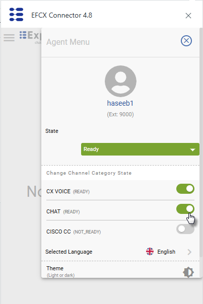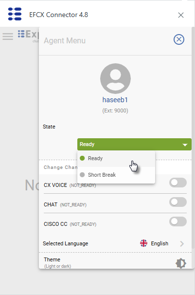 After logging in, an agent may change the CX Voice state to Ready or Not-Ready. On Ready state, he can be able to make inbound and outbound dialogs.