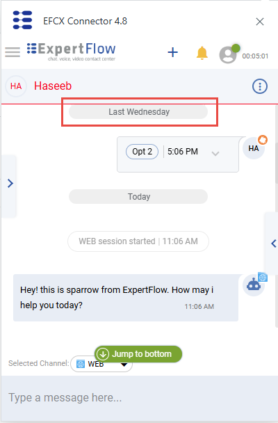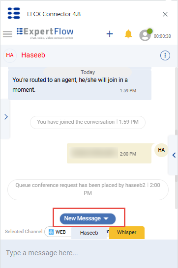 Upon receiving a new message while reading the previous history on the top, the agent will see the New Message button popping up. Click on that to read the newly received message.