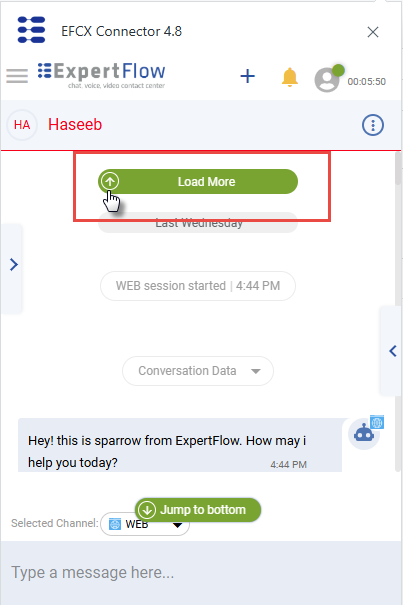 By default, the past conversations are hidden behind a Load More button. If the agent has permission to load the history, can click this button to load the past conversations of the customer. To know about the latest query, go to the bottom of the conversation by clicking on Jump to bottom
