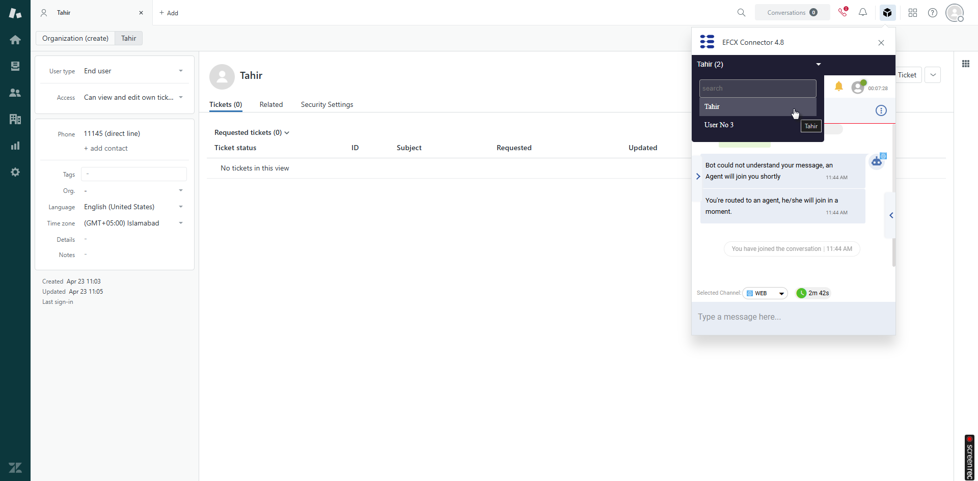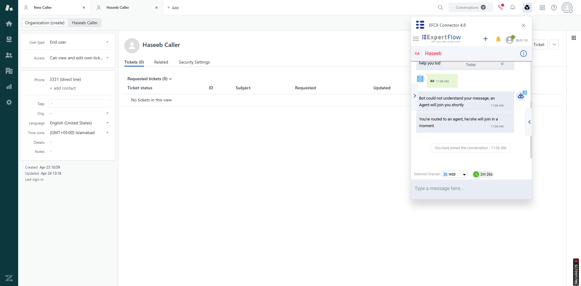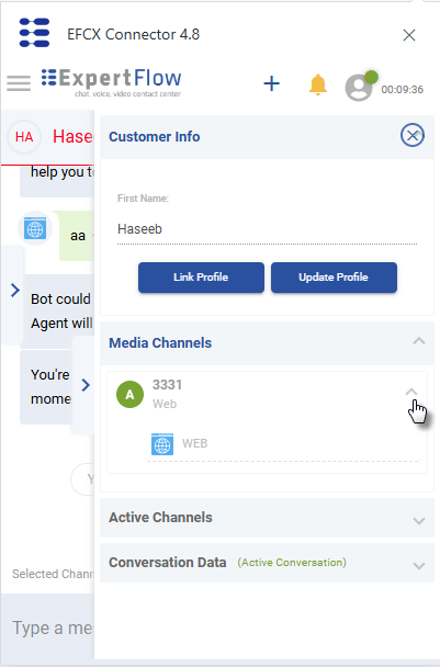 Upon accepting the requests, agents see the Customer Profile data and Media Channel details of the customer on the right under the relevant panes. The CRM profile of the customer is popped up in the background (CRM) as described in the Screen pop section.