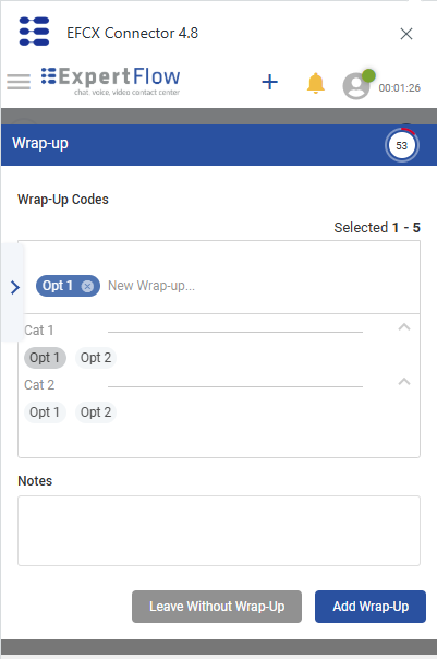 Whenever a conversation is closed from either side, a wrap-up window pops up. The wrap-up timer can be seen on the right-hand side. Pre-defined wrap-up reasons are displayed here. The agent can choose any suitable reason fit to the conversation and add notes as adding a note is optional.
